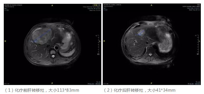 根据多学科讨论结果及建议,患者于2017.06-2017.10行FOLFIRI+爱必妥方案化疗6程,2017.10月行腹部MR评估肝转移灶提示:肝脏转移瘤较前明显缩小,大小41*34mm,CEA:80,化疗后评估肝转移灶退缩显著,可考虑手术切除。