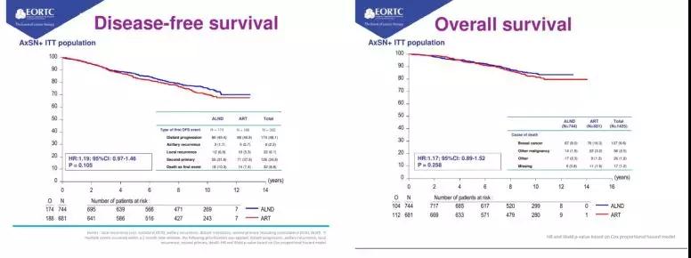 2014年公布的初期分析数据(中位随访6.1年)提示,5年累积腋窝复发率:ALND组 0.43%(4/744);AxRT组:1.19%(7/681);两组的5年DFS率(86.9% Vs 82.7%)和OS率(93.3% Vs 92.5%)均无显著性差异。