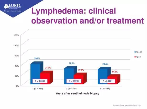 在此次更新的10年随访数据中,患者上肢淋巴水肿的发生率,AxRT组显著低于ALND组(其中治疗后5年发生率:14.5% vs. 29.4%)。