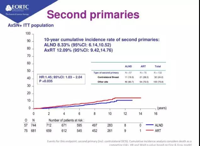值得关注的是,10年第二原发肿瘤发生率(包括对侧乳房DCIS):AxRT组略高于ALND组(12.09% Vs 8.33%),具有统计学显著性差异(HR 1.45;95%CI:1.03-2.04;p=0.035)。