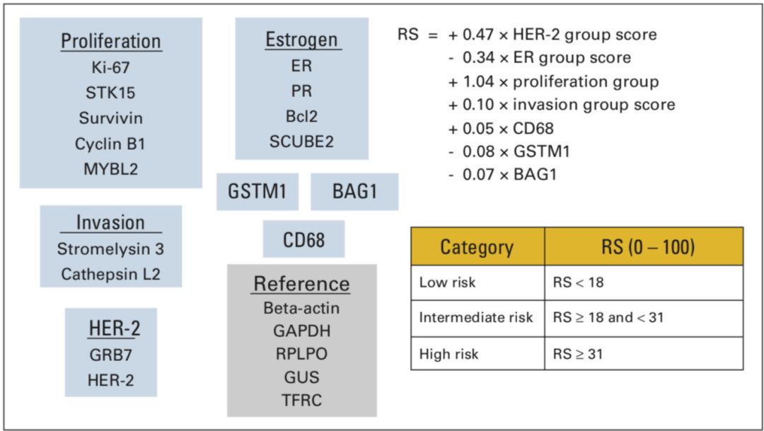 2004年Paik等[4]为通过多基因检测预测ER+ LN-乳腺癌患者的复发风险,根据文献和基因库筛选出250个复发相关候选基因,采用已经得到明确预后数据的NSABP B-20研究中组织蜡块标本进行RT-PCR检测,通过该研究患者预后筛选出与远处复发相关的21个基因,包括了16个肿瘤相关基因(包括增殖、侵袭、HER-2,ER)和5个内参基因。通过复杂的公式计算出复发评分(recurrence score,RS),其数值范围在0-100之间,分为三组:<18为低危,18-31为中危,≥31为高危组。具体基因及计算方法如图1。