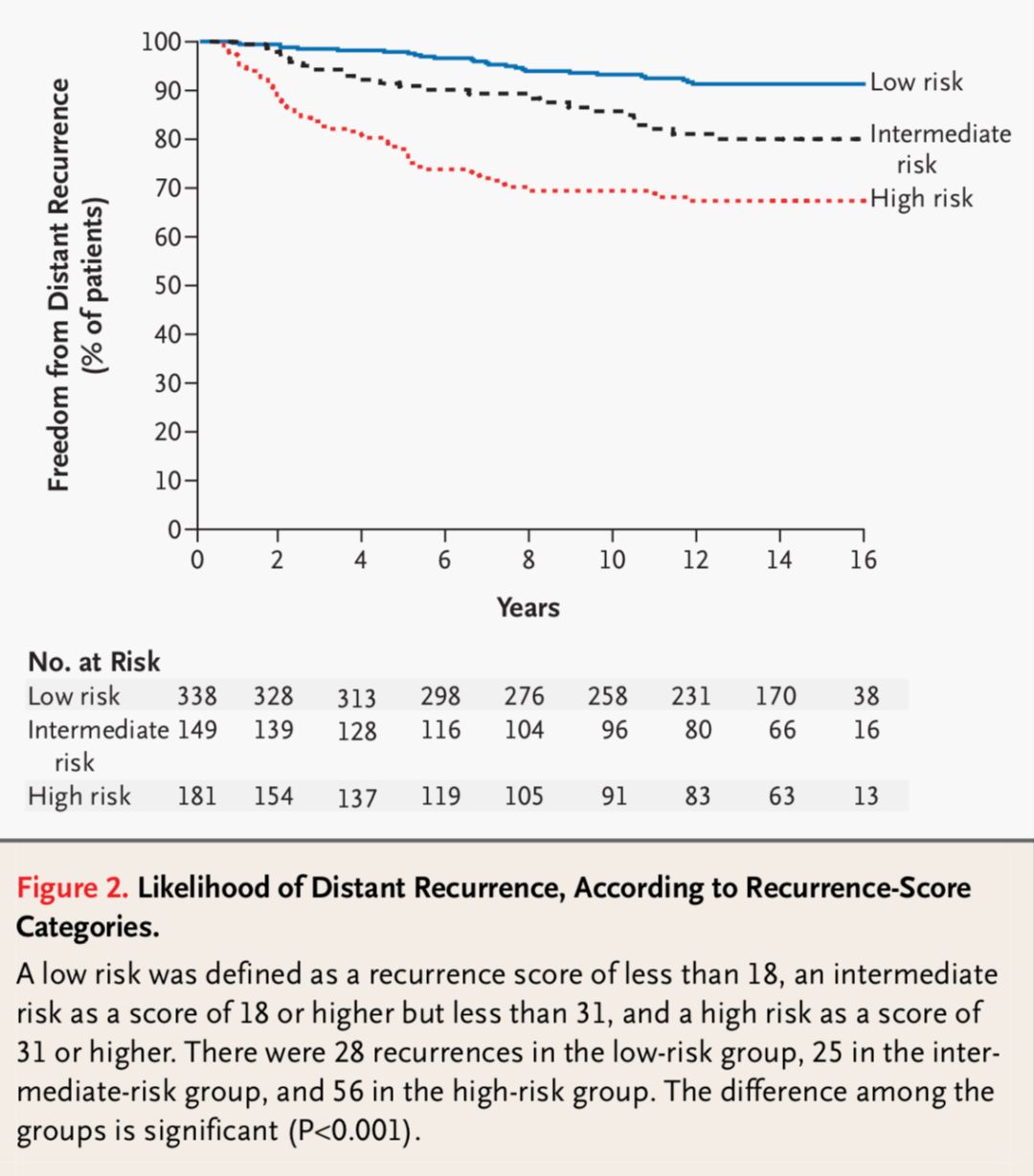 随后,采用该检测方法在另外一个研究NSABP B-14试验中的人群进行了验证。高、中、低危组的10年复发风险分别为30.5%,14.3%和6.8%,很好的验证了该检测方法在预后预测方面的价值。见图2。