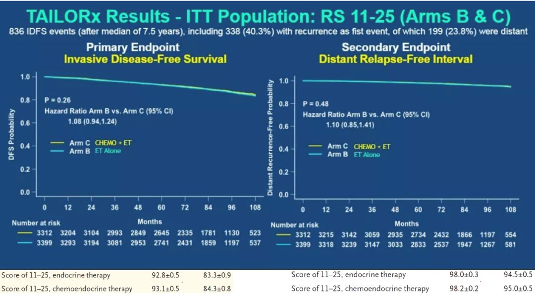 TAILORx研究结果在2018年ASCO大会作为重磅研究发布,并同期发表于NEJM杂志。研究结果表明:RS分值在11和25之间的患者,不论是iDFS还是DRFI,单纯内分泌治疗的B组都不劣于内分泌联合化疗的C组(HR1.08,p=0.26;HR1.03,p=0.80)。见图4。通过亚组分析,最后作者审慎的推荐:对于激素受体阳性,HER-2阴性,淋巴结阴性的早期乳腺癌患者满足以下条件,可以省去化疗: