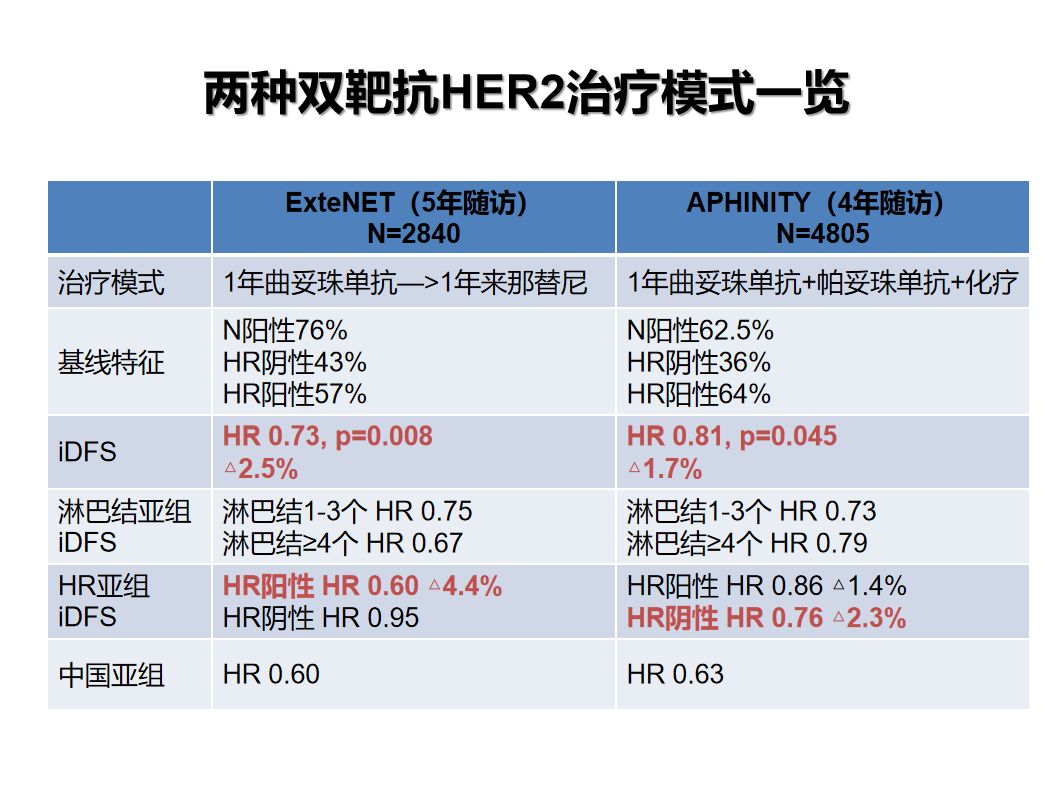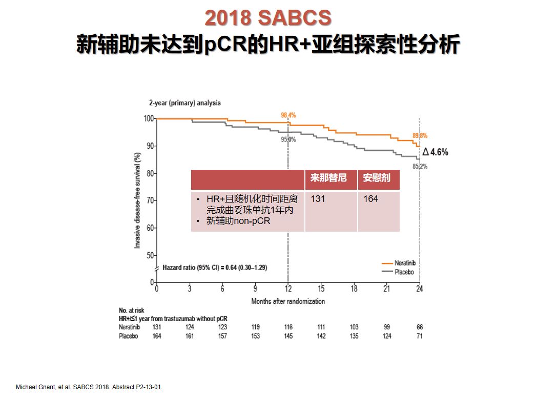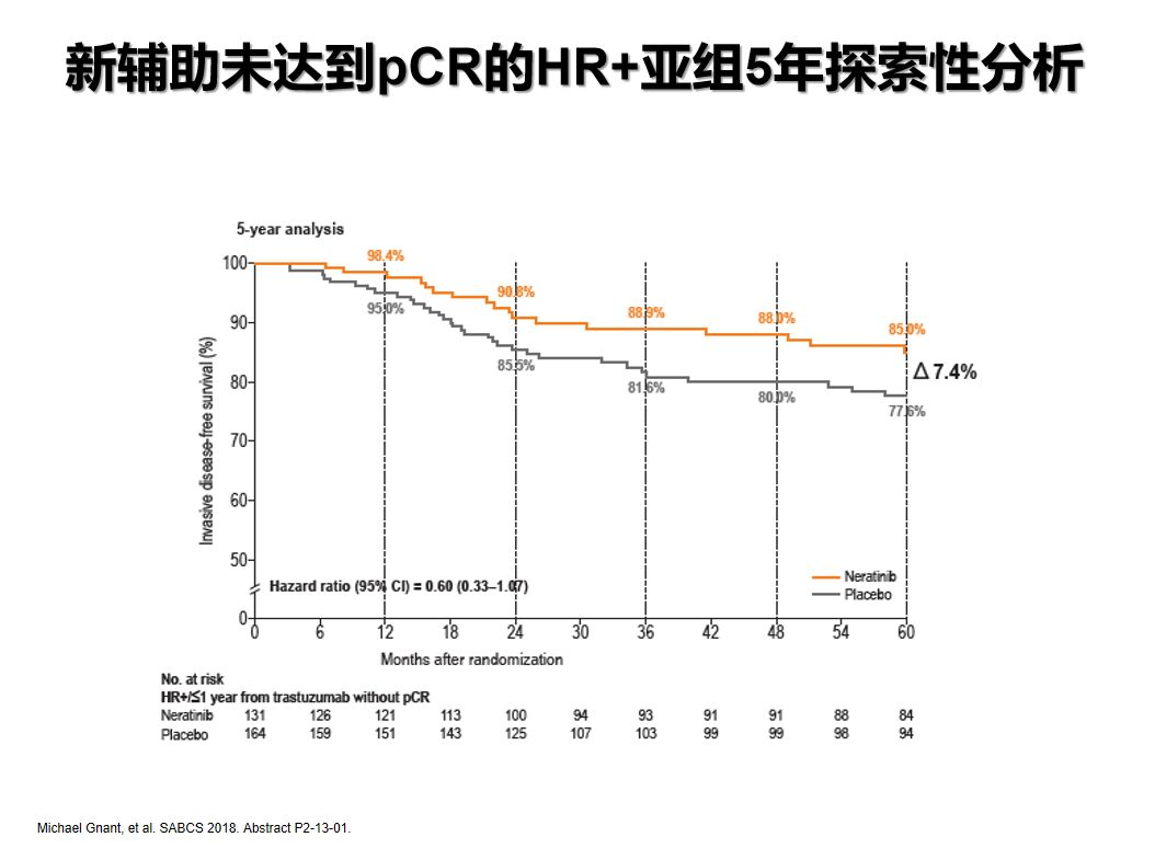 2018 SABCS大会上报道的一项对针对新辅助治疗后non-pCR患者(n=295)的探索性分析显示:2年iDFS绝对获益为4.6%(HR 0.64;95%CI 0.30-1.29),5年iDFS绝对获益为7.4%(HR 0.60;95%CI 0.33-1.07)。该研究结果提示了另一种可行的强化抗HER2治疗模式——“non-pCR升阶来那替尼”。