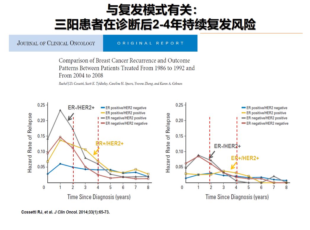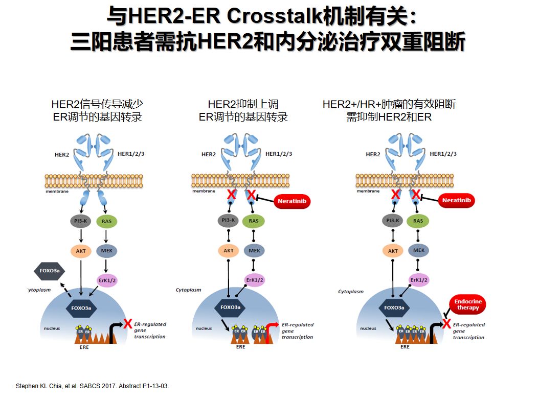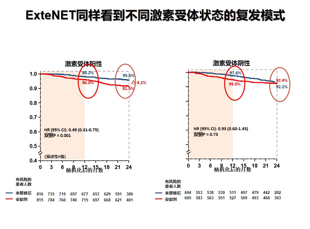 既往研究表明,HR+/HER2+乳腺癌患者在诊断后2-4年存在持续复发风险。ExteNET研究中同样看到了相似的HR-和HR-患者复发模式,HR+亚组患者在“1年曲妥珠单抗序贯1年来那替尼”的强化治疗中获益最显著,可能与HER2-ER Crosstalk机制有关;提示那来替尼强化治疗对HR+/HER2+患者有抗HER2和内分泌治疗存在双重阻断作用。
