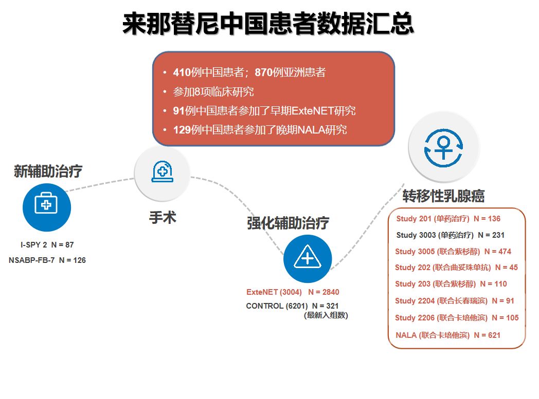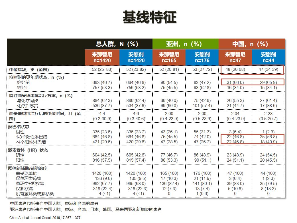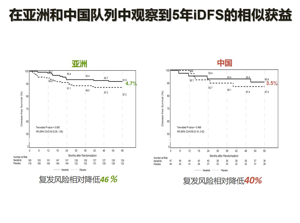 在ExteNET研究中,有91例中国患者贡献了重要的亚洲人群数据。2018年CSCO大会上公布的ExteNET研究亚洲及中国患者数据证实,亚洲及中国HER2阳性乳腺癌患者在接受标准1年曲妥珠单抗治疗后,后续来那替尼强化辅助治疗可以显著延长HER2阳性乳腺癌患者的无病生存期,亚洲组复发风险相对降低46%,中国亚组复发风险相对降低40%。这一疗效结果与全球数据基本一致,甚至略好。