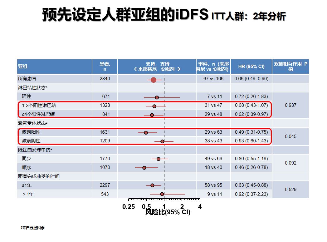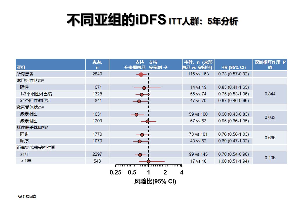 亚组分析提示,淋巴结阳性、激素受体阳性患者获益更显著,2年iDFS绝对获益 4.5%(HR 0.49;95%CI 0.30-.78,p=0.001),复发风险相对降低51%;5年iDFS绝对获益 5.1%(HR 0.58;95%CI 0.41-.82,p=0.002),复发风险相对降低42%。