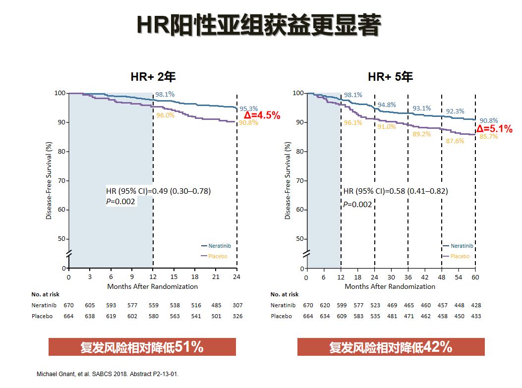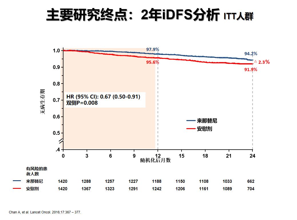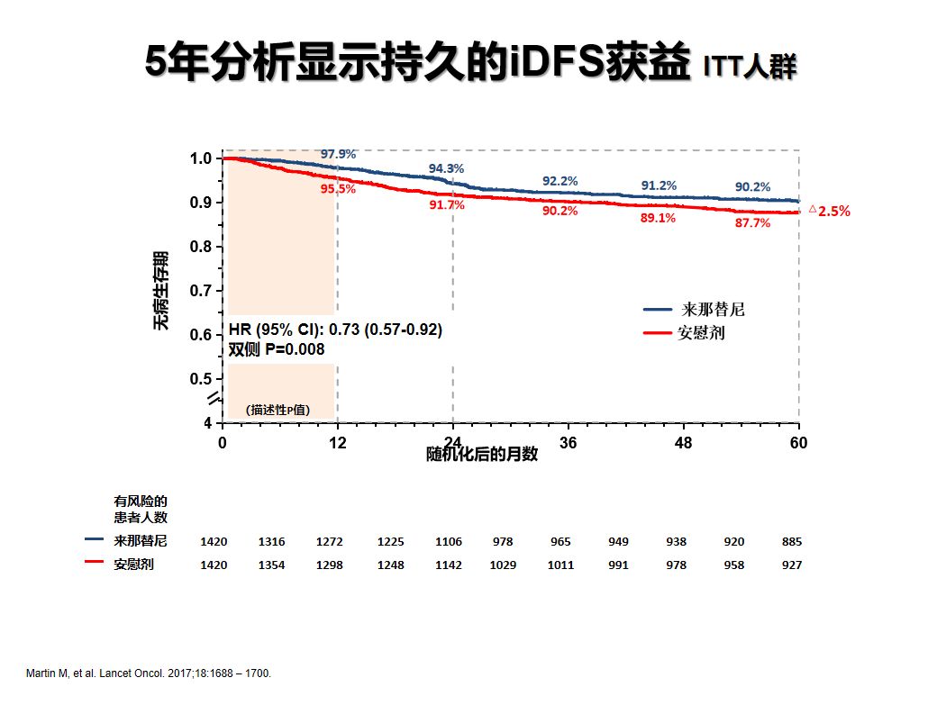 2017年在《柳叶刀肿瘤学》报告的中期分析数据显示:2年iDFS绝对获益 2.3%(HR 0.67;95%CI 0.50-.91,p=0.008),5年iDFS绝对获益 2.5%(HR 0.73;95%CI 0.57-.92,p=0.008);来那替尼强化辅助治疗可显著降低HER2阳性eBC患者复发风险33%,5年降低复发风险27%。