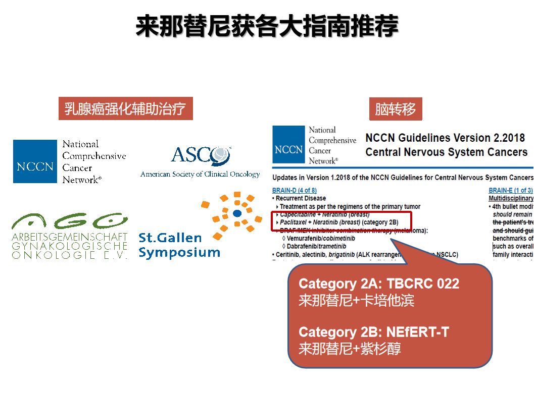 TBCRC 022和NEfERT-T等研究显示了持久的抗肿瘤活性和良好的脑转移抑制作用。因此,NCCN推荐来那替尼联合化疗用于治疗HER2阳性脑转移患者。而基于关键3期研究ExteNET(Study 3004),美国FDA和欧洲EMA已经批准来那替尼用于曲妥珠单抗辅助治疗后的HER2阳性乳腺癌强化辅助治疗。