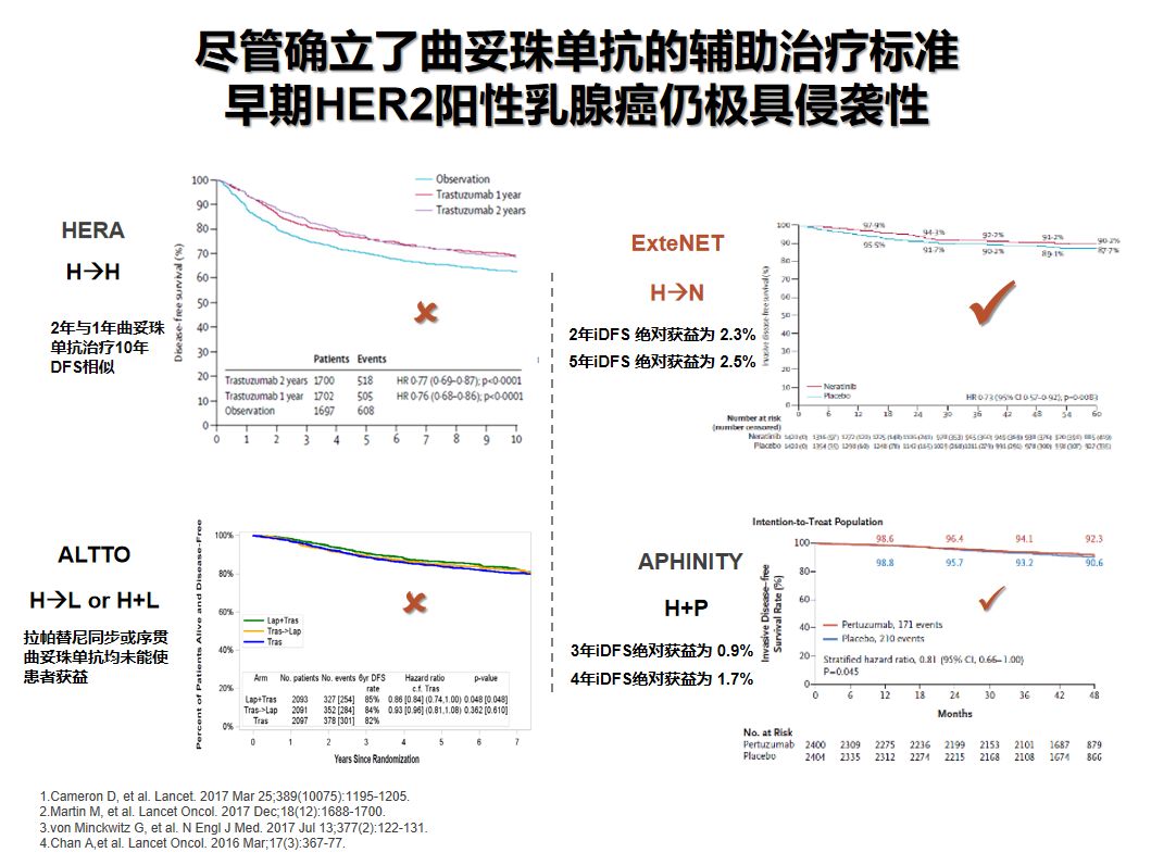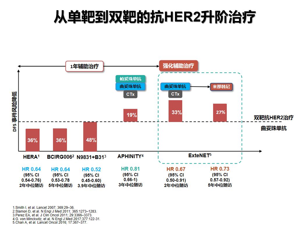 为了进一步满足HER2阳性早期乳腺癌患者的治愈需求,学术界提出了在曲妥珠单抗辅助治疗基础上进行强化靶向治疗的策略。从单靶到双靶的抗HER2“升阶梯”治疗正是目前新的临床研究进展。其中,APHINITY和ExteNET等研究提供了具有明确获益价值的强化抗HER2治疗策略:“1年曲妥珠单抗序贯1年来那替尼”或“1年曲妥珠单抗+帕妥珠单抗+化疗”。