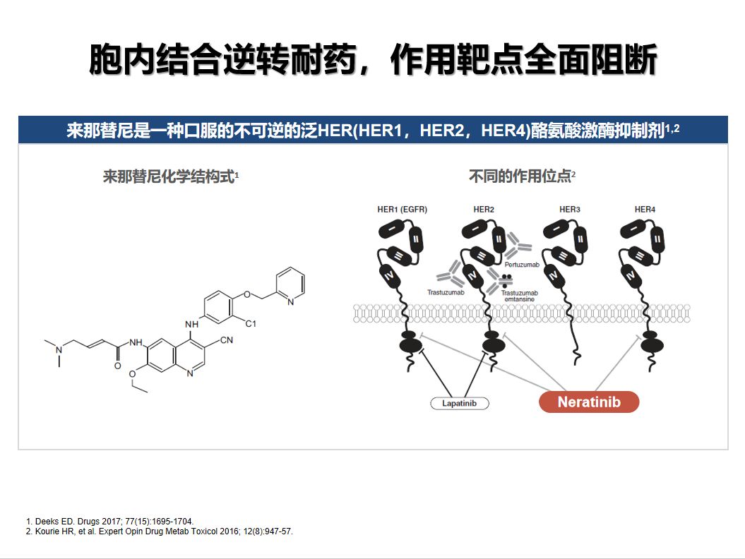 口服制剂来那替尼是一种强效、不可逆的酪氨酸激酶抑制剂,作用靶点广泛而特异,可靶向作用于HER1/HER2/HER4,是目前HER2药物中靶点最为广泛的一类药物,在曲妥珠单抗、帕妥珠单抗、T-DM1、拉帕替尼耐药后仍可以考虑来那替尼为主的治疗。