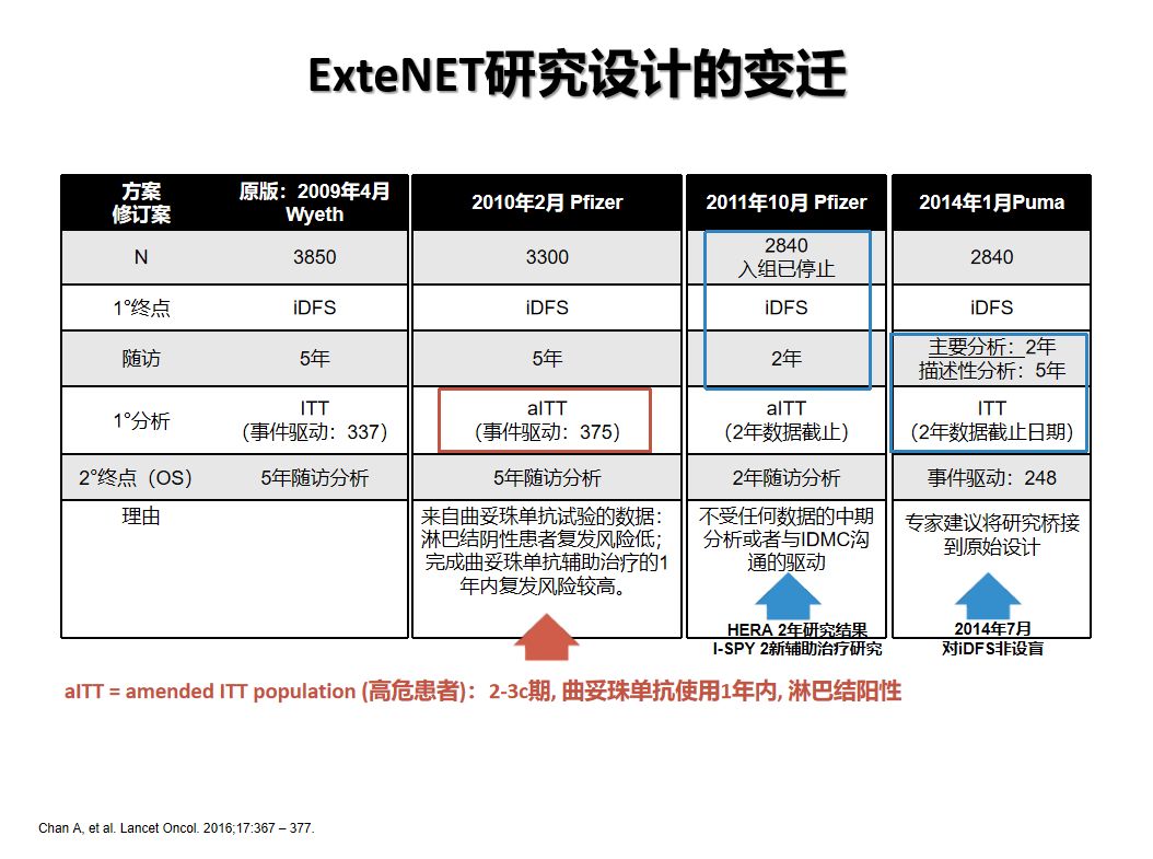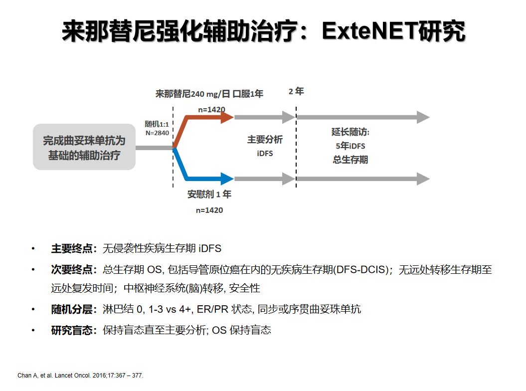 ExteNET研究是一项全球多中心、随机对照的Ⅲ期临床研究,旨在评估1年曲妥珠单抗标准治疗基础上序贯1年来那替尼是否可为HER-2阳性乳腺癌患者带来更多获益。ExteNET研究是目前一项难以重复的大样本RCT,而且是唯一在辅助抗HER2治疗研究中获得5年随访阳性结果的Ⅲ期临床研究。