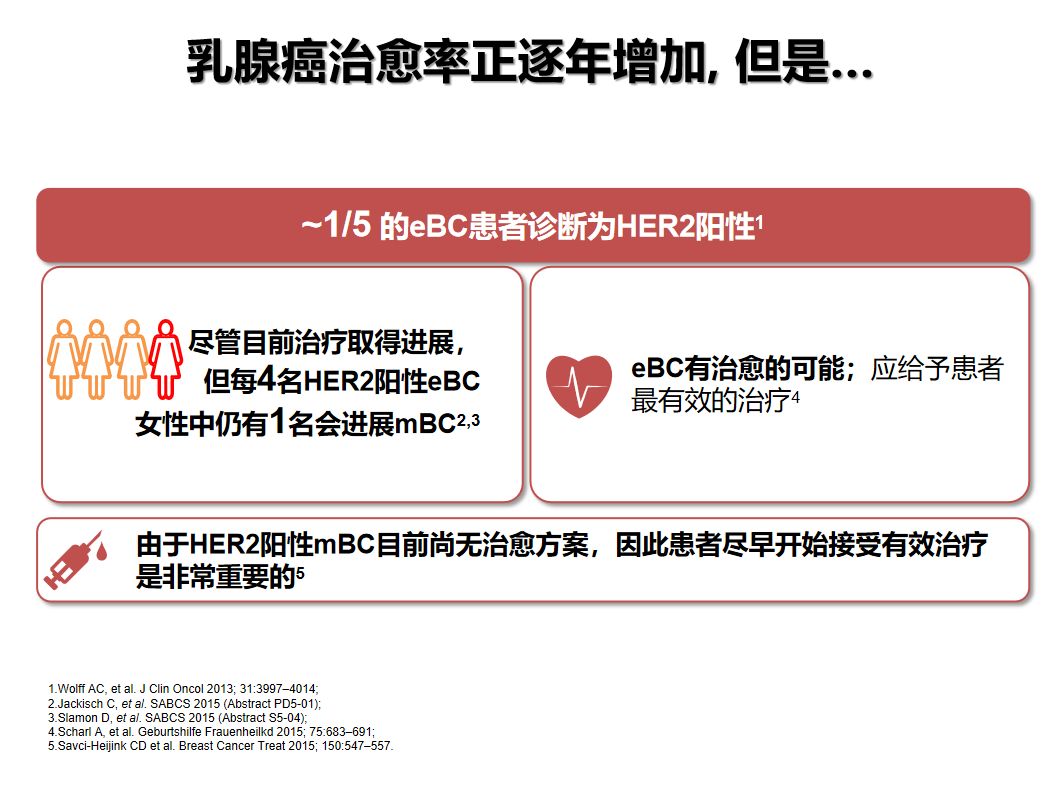 人表皮生长因子受体2(HER2)阳性乳腺癌是凶险程度很高的一种亚型,约占乳腺癌总体的20%~30%。HER2阳性乳腺癌的特点是肿瘤进展快、容易发生淋巴结或血管转移,对内分泌治疗不敏感,整体预后不佳。尽管目前已经确立了曲妥珠单抗的辅助治疗标准,但每4名HER2阳性eBC女性中仍有1名会进展为mBC。因此,尽早接受有效的抗HER2治疗是早期患者获得治愈机会的重要前提。