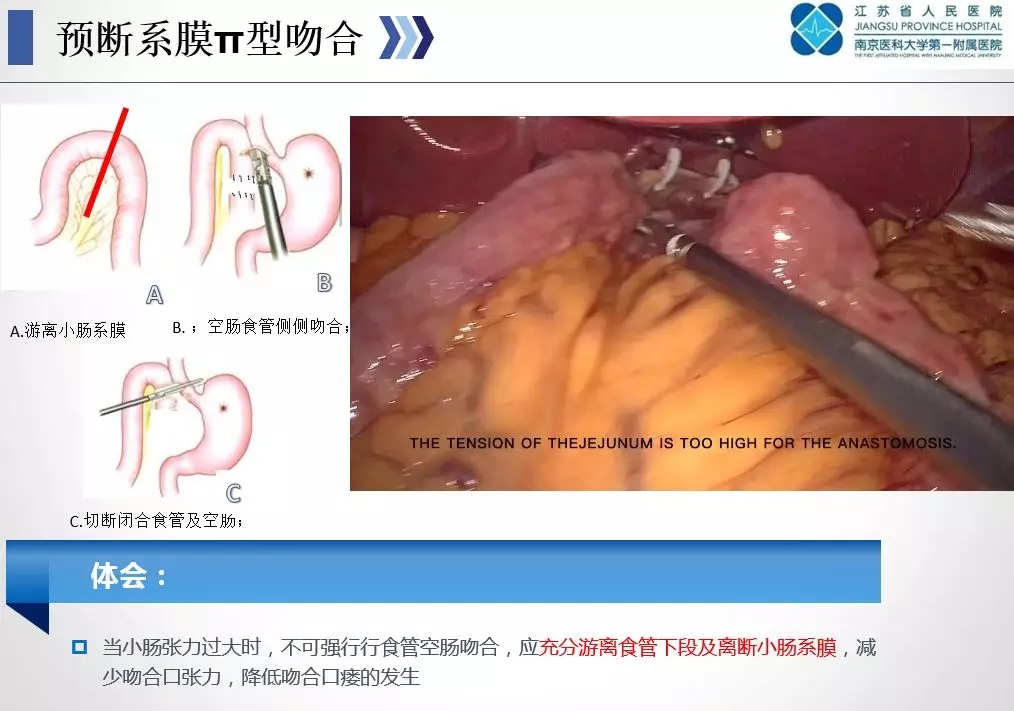 为了更方便地应用全胃切除消化道重建的方式,笔者所在中心根据肿瘤上缘与齿状线的关系,将食管胃结合部癌分为三型(图2):A型,肿瘤上缘位于齿状线下方;B型,肿瘤上缘位于齿状线上方1 cm以内;C型,肿瘤上缘位于齿状线上方超过1 cm。A型一般在齿状线上2 cm切断食管可满足安全切缘的要求,推荐行π型吻合。此法操作简单,吻合时间短。但是小肠系膜短的患者行该术式时易引起吻合口张力大,导致吻合口瘘的发生。笔者建议此类患者可以在行食管空肠吻合前,预先裁剪小肠系膜,以降低吻合口张力,并建议在吻合口最高点作加固缝合,此法称为预断系膜π型吻合(图3)。此外,由于π型吻合前未切断食管,不利于食管切缘的判断,故建议应用于肿瘤未侵犯齿状线的患者。B型的上缘位于齿状线上方,为了满足安全切缘的要求,同时不过多切除腹段食管,需在吻合前准确地判断食管切缘,故推荐Overlap吻合。C型肿瘤的安全切缘位置较高,往往难以行直线型吻合,需推荐行管型吻合(Orvil或反穿刺)。如全腔镜下吻合困难也可考虑行辅助切口吻合。