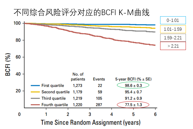 主要研究终点为无乳腺癌间期(BCFI),根据7个临床病理特征建模(年龄、淋巴结情况、肿瘤大小和分期、ER受体水平、PgR受体水平、Ki-67水平),进行复发风险综合评测,综合风险越高的组BCFI越低,如下图所示,我们可以看到总体5年BCFI为90.8%,评分最低组的5年BCFI为98.6%,评分最高组为77.5%。