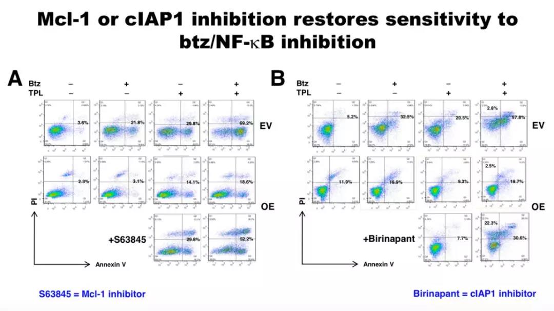 结果:①硼替佐米(BTZ)耐药的MM细胞表现出典型和非典型NF-κB信号级联的多个关键蛋白水平的显著增加,这与NF-κB转录活性增加有关。②野生型IRF4的过度表达急剧降低了药物对BTZ单独或与NFκB抑制剂联合的敏感性。但IRF4过表达并不能阻止NF-κB依赖基因(如bcl-xl、TNFAIP3/A20)的失活和下调,这表明IRF4作用于NF-κB的下游。③IRF4过表达未能恢复MYC的表达,而CIAP1和Mcl-1在mRNA水平和蛋白水平的表达均显著下调。并且IAP抑制剂(Birinapant/TL32711)或Mcl-1抑制剂(S63845)均可克服IRF4过表达所致的BTZ耐药性。