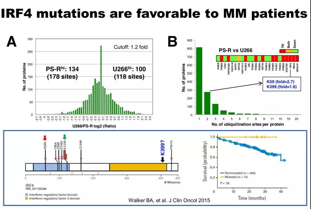 结论:IRF4在MM细胞中高表达,可能通过NF-κB依赖的机制作用于NF-κB信号通路的下游,直接作用于CIAP1和MCL-1从而产生耐药性(并非作用于MYC)。然而,在MM患者中的IRF4点突变(至少在某些赖氨酸位点)可能导致功能丧失,或许预示更好的生存结局。