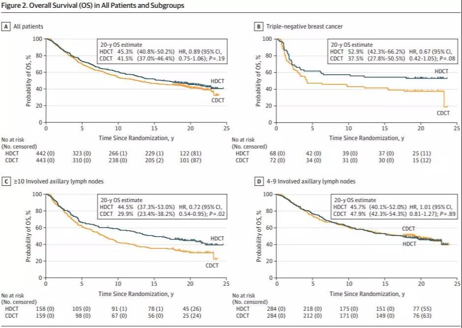 结果显示HDCT组和CDCT组患者的20年OS率分别为45.3%和41.5%(HR 0.89;95%CI,0.75~1.06)。其中,三阴性乳腺癌以及存在10枚以上腋窝淋巴结转移的患者,20年OS率均有显著改善,两者绝对改善分别为15.4%(HR 0.67,95% CI 0.42~1.05)和14.6%(HR 0.72;95% CI 0.4~0.95)。两个治疗组在20年内第二恶性肿瘤或主要心血管事件的累积发病风险相似(HDCT组第二恶性肿瘤的20年累积发病风险为12.1%,CDCT组为16.2%,P=0.10),尽管HDCT组的患者更常患有高血压(21.7% vs 14.3%,P=0.02),高胆固醇血症(15.7% vs 10.6%,P=0.04),心律失常(8.6% vs 4.6%,P=0.005)。