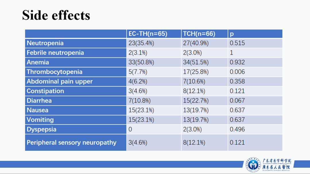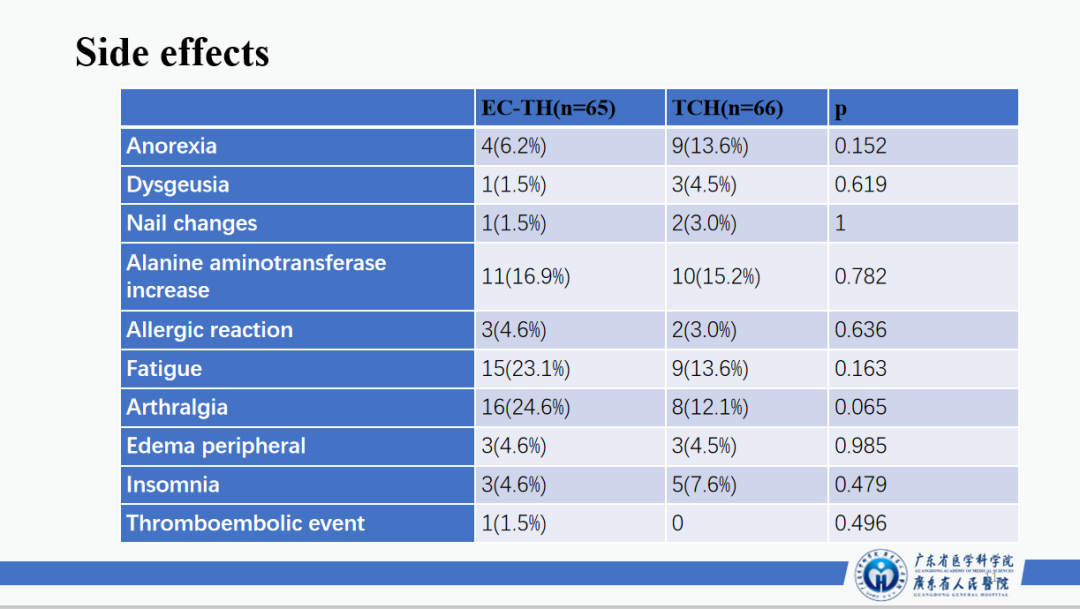 这是第一项前瞻性随机对照II期研究,头对头对比6TCH与4EC-4TH作为HER2阳性乳腺癌新辅助临床研究,研究发现两组的不良反应发生率没有统计学差异,但是6TCH组有更高的pCR率,这个研究结果有可能改变目前HER2阳性早期乳腺癌的新辅助治疗策略。
