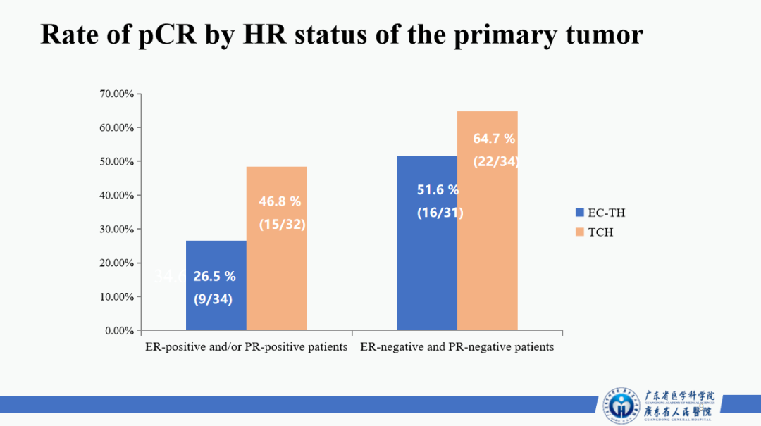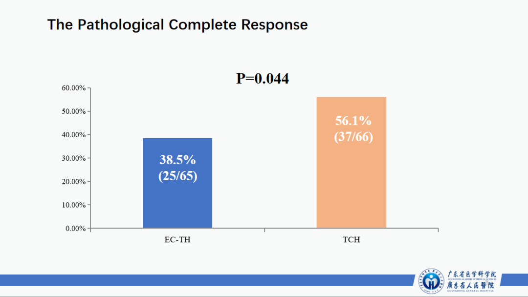 从2016年9月开始至2019年11月入组研究结束,共131例患者纳入研究分析。试验组6周期TCH(多西他赛+卡铂+赫赛汀)方案的总pCR率为56.1%(37/66)(95% CI 44.1–68.0),显著高于对照组4EC-4TH(4周期表柔比星+环磷酰胺,序贯4周期多西他赛+赫赛汀)的38.5%(25/65)(95% CI 26.6–50.2)(P=0.044)。在不良反应的分析中,4EC-4TH有更高比例的中性粒细胞减少,而6TCH组有更高比例的贫血和血小板下降的发生。