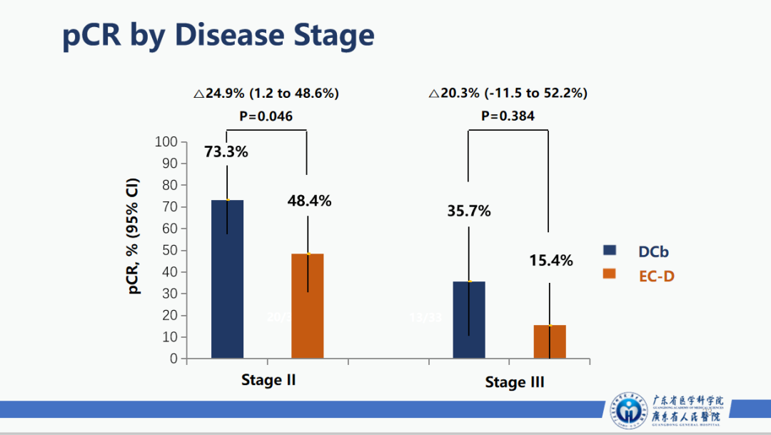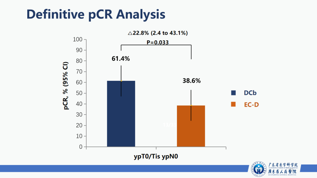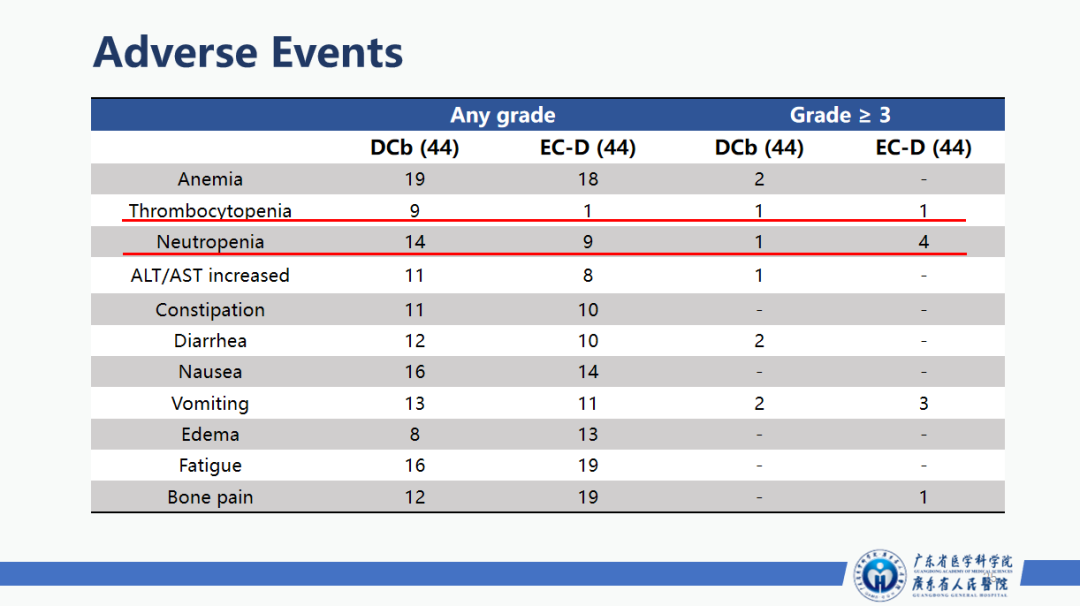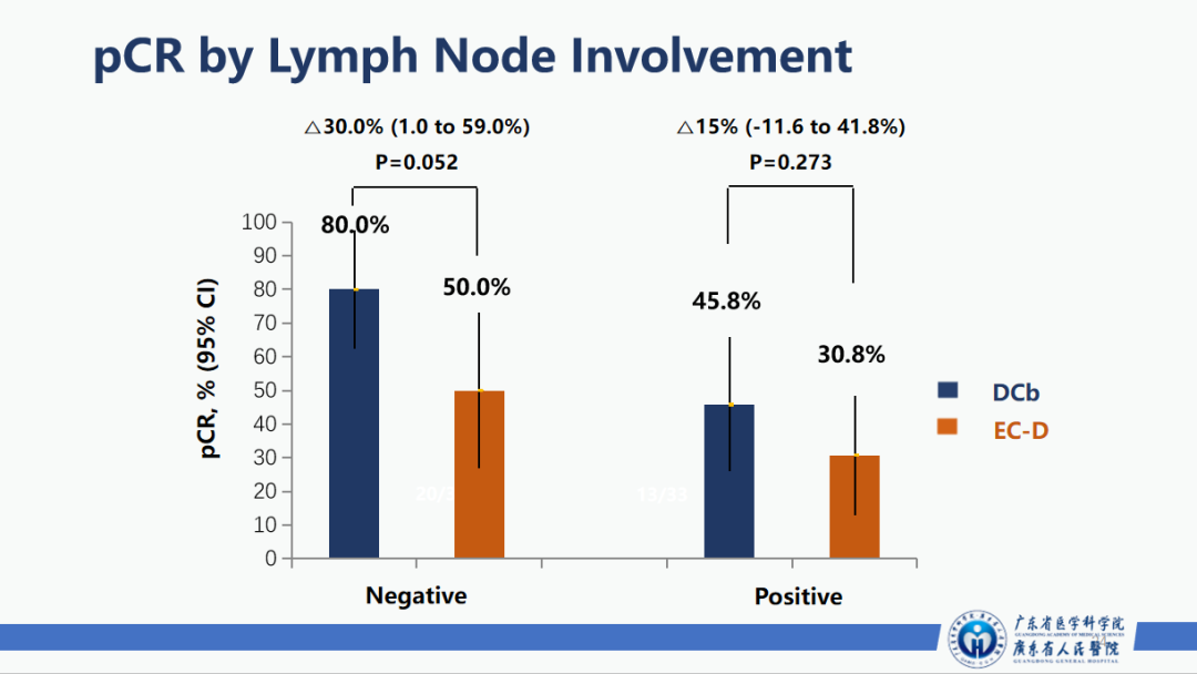研究从2016年4月开始入组至2019年12月入组结束,试验组6周期DCb(多西他赛+卡铂)方案的总pCR率为61.4%(95%CI 47.0 - 75.8),相较于对照组4EC-4D的38.6%(95%CI 24.3 - 53.0)提高了22.8%(odds ratio 2.52,95% CI 2.4 - 43.1;P=0.033)。在不良反应的分析中,使用卡铂带来了更多的血小板减少,但集中在1-2度;而4EC-4D组有更多的中性粒细胞减少的发生。