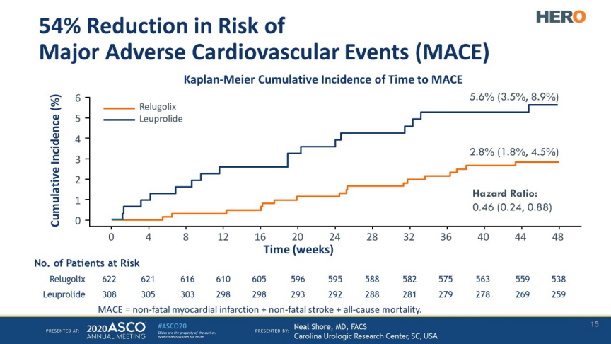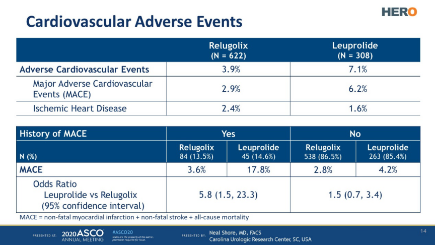本研究中Relugolix的所有关键次级疗效终点指标均优于亮丙瑞林(P<0.0001)。在研究睾酮恢复亚组中,停止治疗90天后,Relugolix组的中位睾酮(T)水平为270.76 ng/dL,而亮丙瑞林组为12.26 ng/dL。在预定分析中,Relugolix组的主要不良心血管事件(MACE)发生率低于亮丙瑞林组(分别为2.9%和6.2%);除此之外,安全性和耐受性大致相似。
