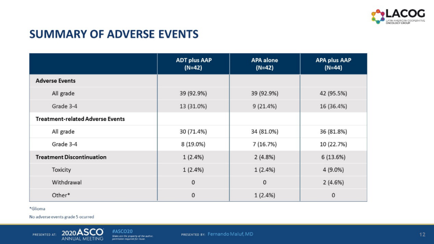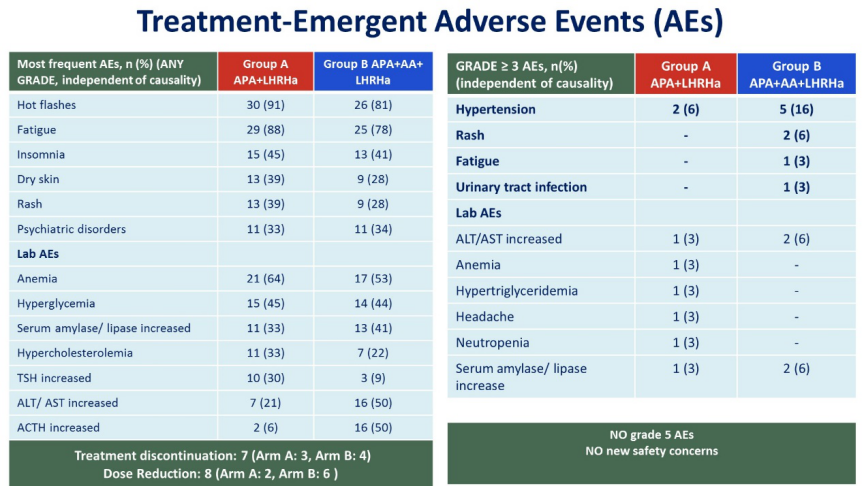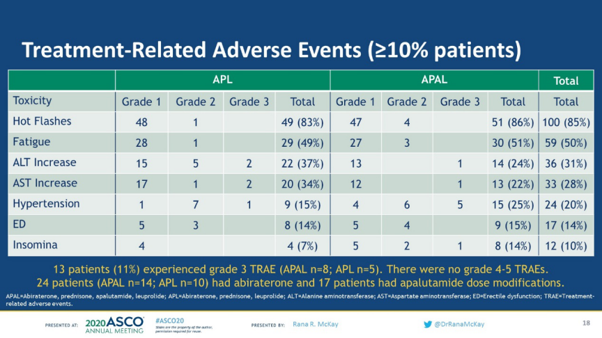 AAP+ADT组、APA组和APA+AAP组各级别TRAEs发生率分别为71%、64%、65%。≥3级TRAE发生率分别为12%、9%、16%,各组差异有统计学意义(P<0.01)。9例患者(7%)在25周前停止治疗,其中5例(4%)为毒副反应。停止治疗的患者的分布为AAP+ADT组1例,APA组2例以及APA+AAP组6例。