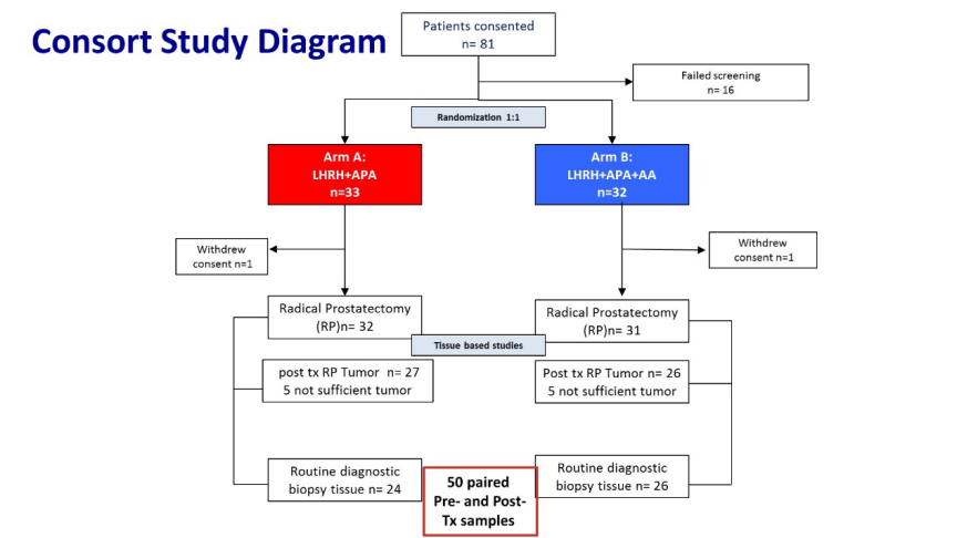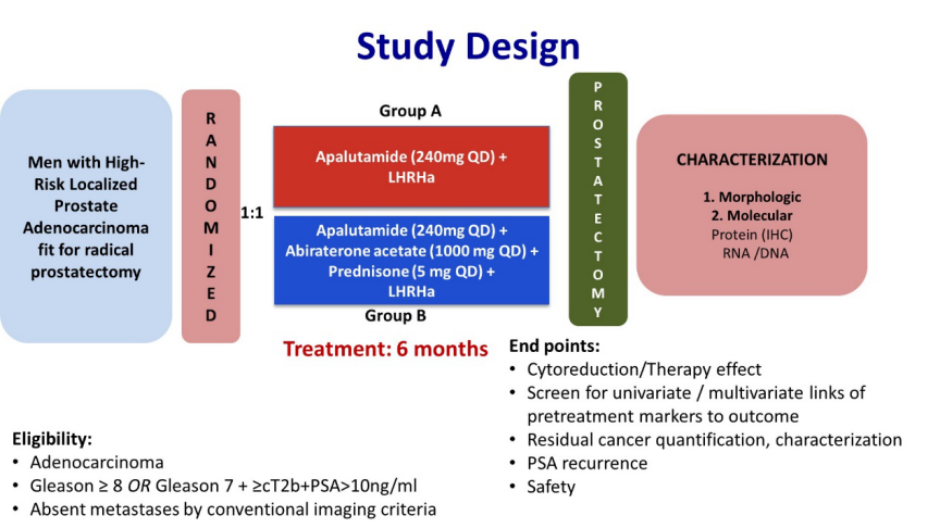 方法:本研究为Ⅱ期新辅助研究,将所有满足条件的LHRPC患者按1:1随机分配到APA+LHRHa+AA组或者APA+LHRHa 组中。研究共进行6个月,6个月后行前列腺癌根治术。LHRPC 患者需满足≥ cT2 + Gleason评分 ≥ 8 or ≥ cT2b + Gleason 评分≥ 7 + PSA > 10 ng/mL。