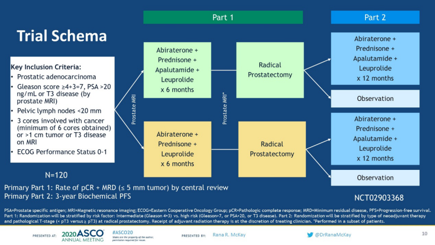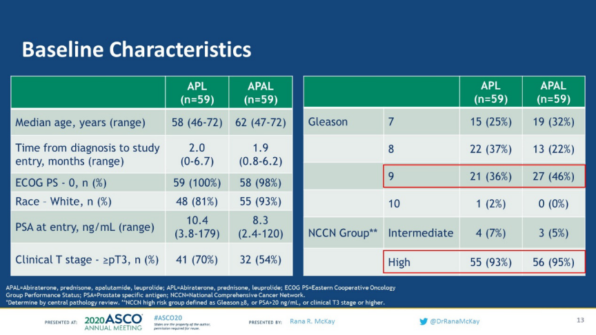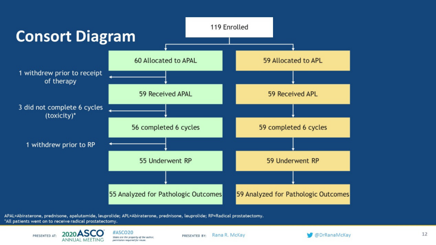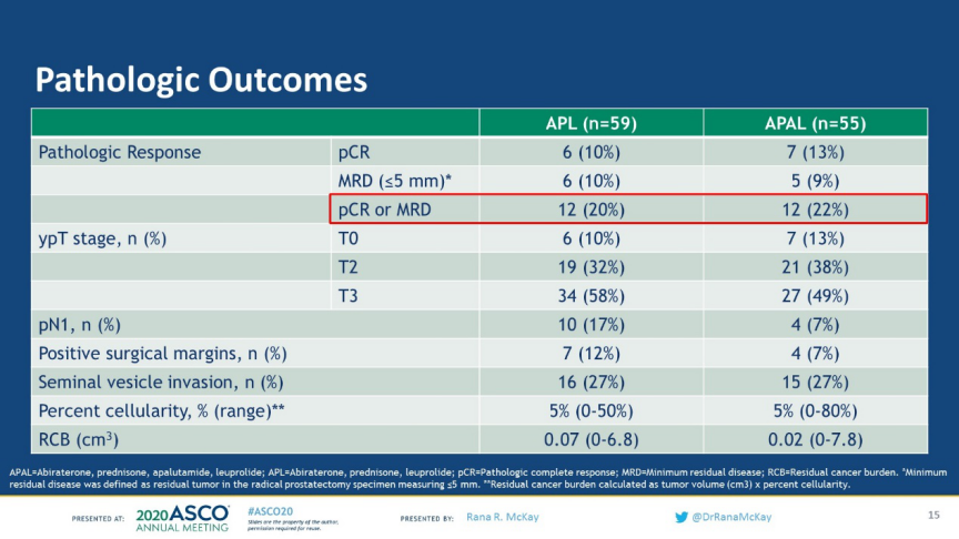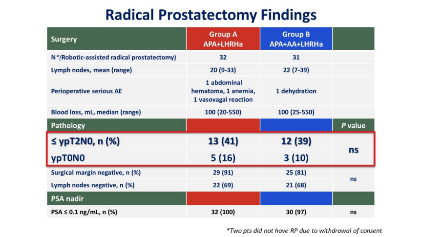 方法:研究所纳入的所有患者均满足Gleason评分≥4+3=7,PSA值>20 ng/mL或T3病变(前列腺磁共振检查判断),淋巴结<20 mm。研究的第一部分,患者被随机分为阿比特龙+泼尼松+阿帕鲁胺+亮丙瑞林(APAL)或阿比特龙+泼尼松+亮丙瑞林(APL)两组,研究共进行6个周期,每个周期28天,之后进行RP治疗。所有RP术后病理均接受病理中心检查。主要终点是完全病理应答率(pCR)或最小残留病变率(MRD,肿瘤≤为5 mm)。次要终点包括PSA反应、RP手术分期、切缘阳性率和安全性。
