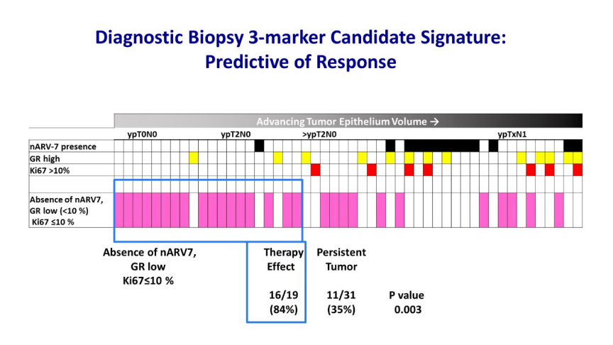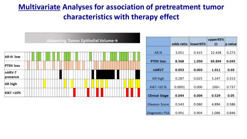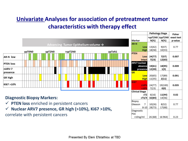 尽管PSA反应一致,但我们记录了肿瘤活性测量的异质性:TV(0-11.5cc),TC(1-80%),TEV(0-6.1cc)。单因素分析显示:≤ypT2N0与候选预测分子特征(p<0.0001)、PTTEN的表达(p=0.004)、无筛状/导管内扩散(p=0.002)的诊断活检阳性有关,但与Gleason评分无关。在多变量分析中,只有候选预测分子与结果相关(p=0.003)。当通过TV、TC和TEV测量进行分析时,结果与上述发现相同的。