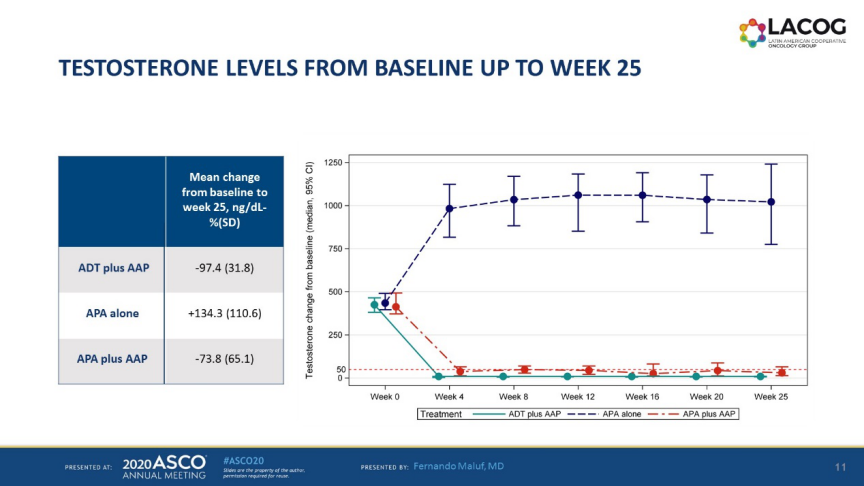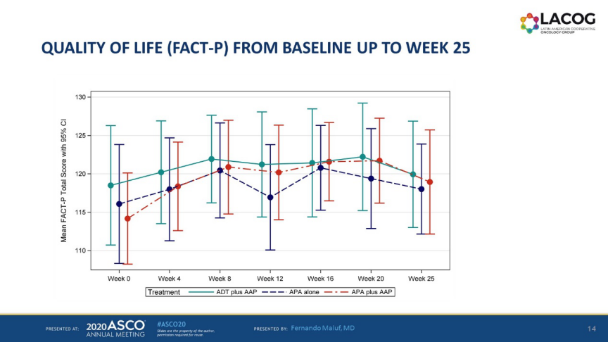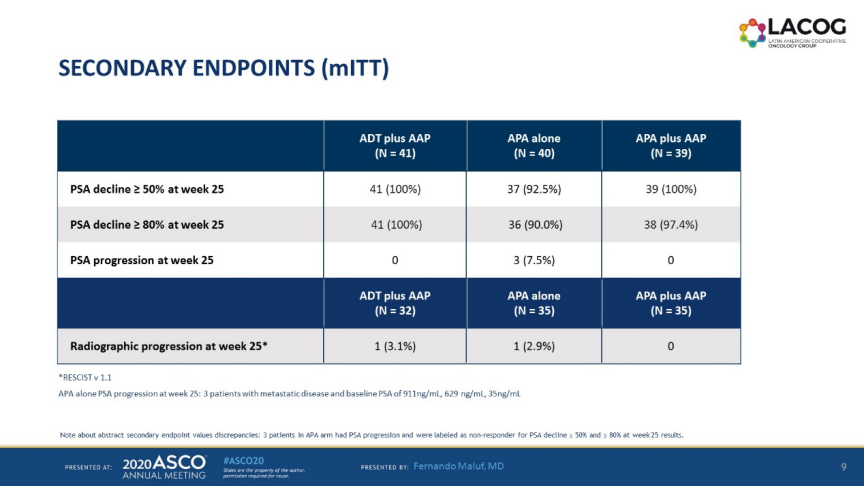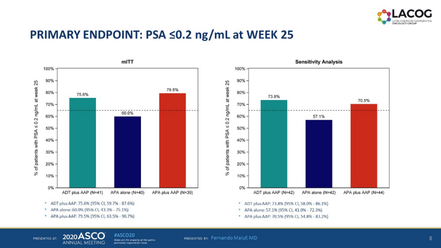 结论:AAP+ADT组和APA+AAP组在PSA反应方面均有较高的疗效。所有治疗组在第25周时影像学疾病控制情况以及前列腺特异性抗原下降≥80%的情况相似。单独使用APA的毒性较小。因此APA+AAP和单独APA是非常有前景的治疗方案。