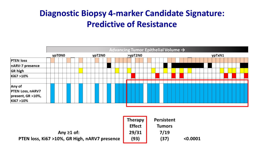 通过病理学手段来评价治疗效果。研究指标包括分期、肿瘤体积(TV)、肿瘤细胞百分比(TC)、肿瘤上皮体积(TEV:TCxTV)等。用IHC[AR信号(AR-N、ARC19、ARV7、PSA)、PTEN、糖皮质激素受体(GR)、Ki67、p53、Rb]和DNA/RNA序列评价候选预后标志物在诊断活检中的表达。测试先前确定的候选预测分子的特征 (AR-N过表达,nARV7缺失,无GR过表达,Ki67≤为10%)。采用了单变量和多变量方法对数据进行分析。