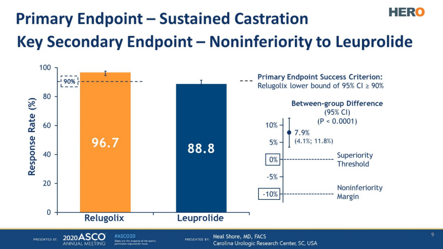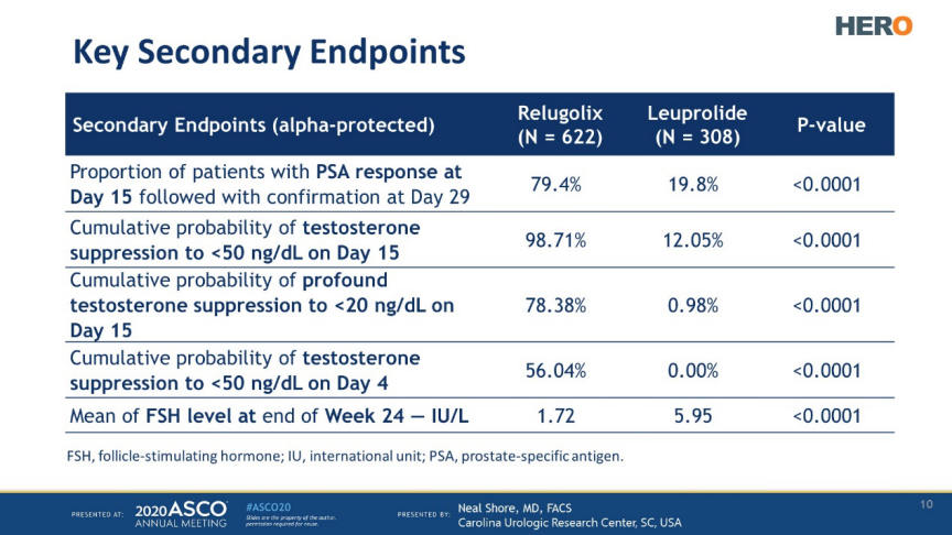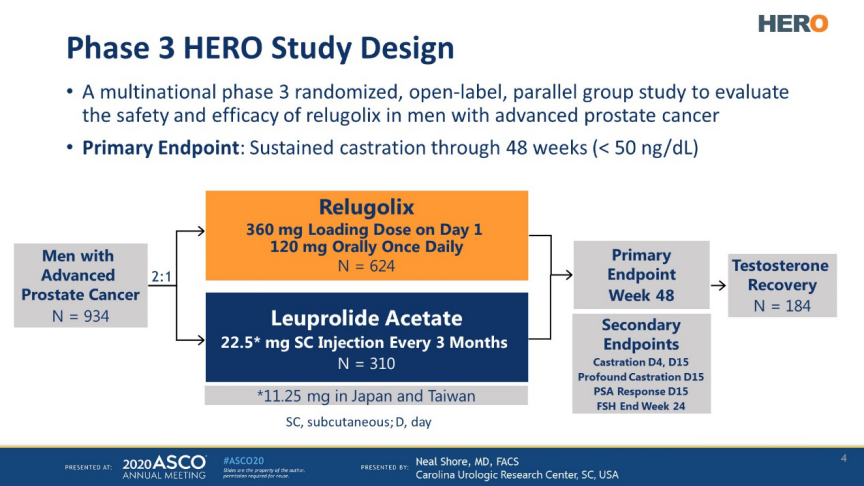 HERO研究:比较口服促性腺激素释放激素受体拮抗剂瑞relugolix与醋酸亮丙瑞林治疗晚期前列腺癌的Ⅲ期试验(摘要号:5602)