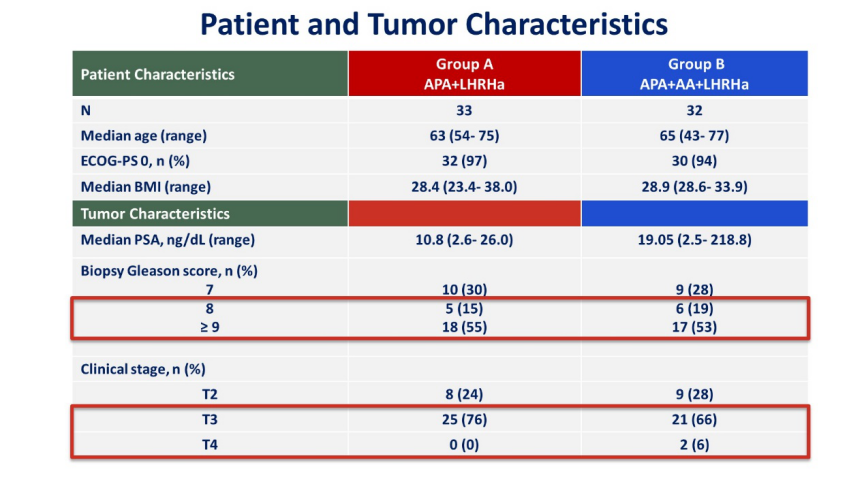 新辅助阿帕鲁胺(APA)联合亮丙瑞林(LHRHa)及联合或不联合阿比特龙(AA)治疗局限性高危前列腺癌(LHRPC)(摘要号:5504)