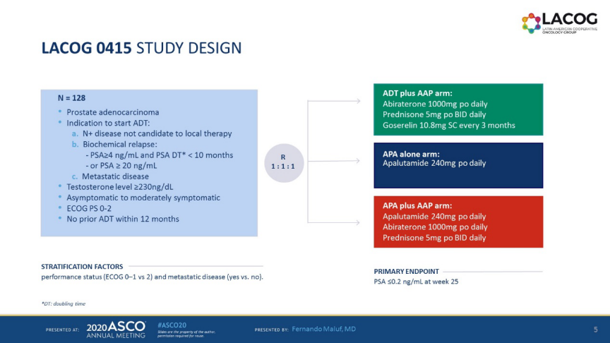 LACOG0415研究:在非去势睾酮水平的晚期前列腺癌患者中,醋酸阿比特龙加泼尼松(AAP)联合ADT与单用阿帕鲁胺(APA)或AAP+APA的II期随机试验(摘要号:5505)