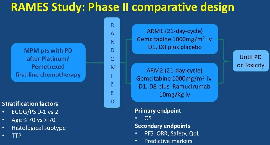 背景:RAMES研究(EudraCT Number 2016-001132-36)是一项多中心、双盲、随机的II期试验,探索在培美曲塞联合铂类方案后,将吉西他滨与雷莫芦单抗联合作为MPM患者二线治疗方案的有效性和安全性。