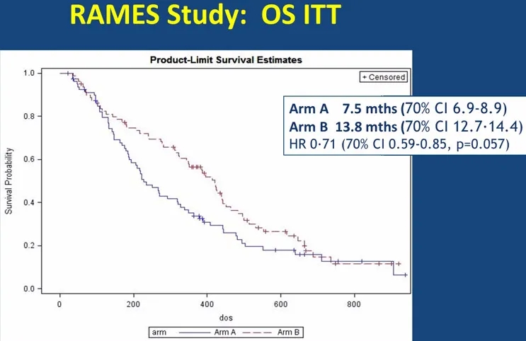 方法:患者1:1随机分组,第1天和第8天接受吉西他滨1000 mg/m2静脉注射,同时第1天使用安慰剂(A组)或雷莫芦单抗(B组)10 mg/kg静脉注射,每21天为1周期,直到不可耐受或疾病进展。根据ECOG PS (0-1 vs 2)、年龄(≤70 vs > 70岁)、组织学(上皮样vs .非上皮样)和一线治疗后进展时间(TTP)对患者进行分层。主要终点是总生存(OS)。假设A组1年OS率为 40%,研究期望在B组中1年OS的绝对改善率为12%(HR= 0.70)。设定α=0.15,检验效能为80%,进行单侧的log-rank检验,共需要156例样本发生114例事件。