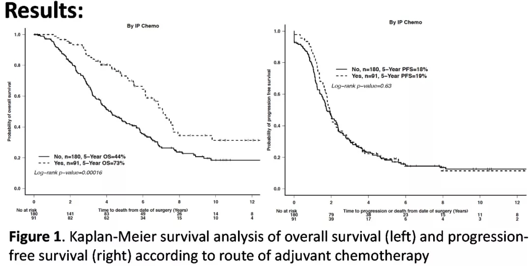 研究发现,相比于IV组,IP组更可能行积极的手术(p<0.001)、手术时间更长(p<0.001)及更可能无残留病灶(p<0.001)。中位随访期为51.6个月。IP组和IV组的5年PFS分别为19% vs. 18%(p=0.63),OS分别为73% vs.44%(p=0.00016)。