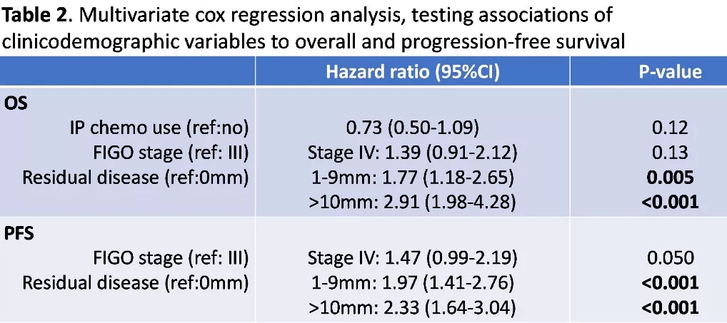 在多变量模型中控制协变量后发现,IP不是OS的显著预测因素(p=0.12)。在无残留病灶患者中(IP组61例,IV组69例),IP组和IV组的5年PFS分别为28% vs. 26%(p=0.67),5年OS分别为81% vs. 60%(p=0.059)。在残留病灶为1~9mm患者中(IP组29例,IV组31例),IP组和IV组的PFS分别为30% vs. 48%(p=0.076),OS分别为60% vs. 43%(p=0.74)。