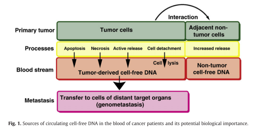 图1:肿瘤患者血液中循环cfDNA的来源及其潜在的生物学意义