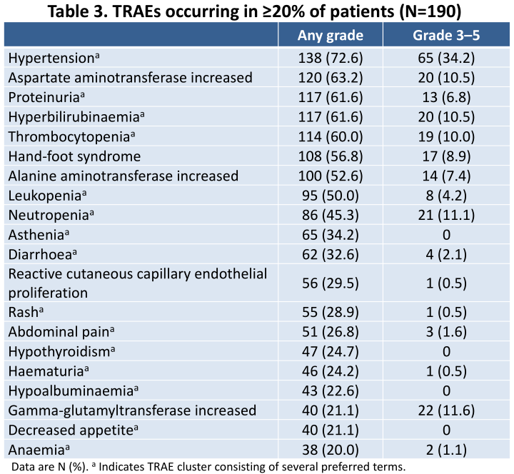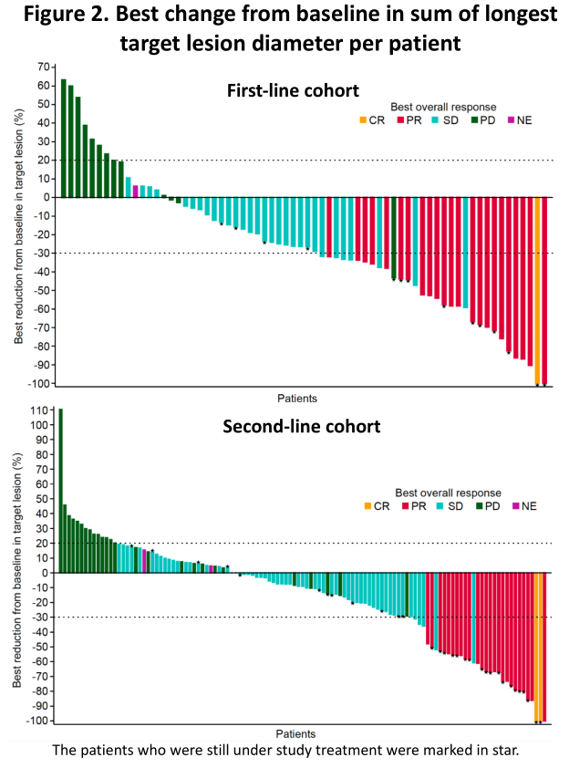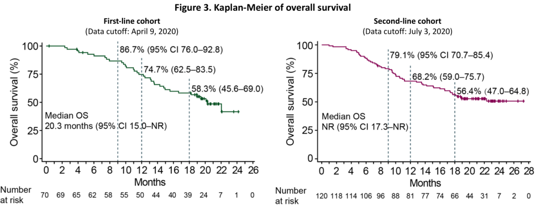 结果:一线治疗队列中共纳入70例患者,二线治疗队列中纳入120例患者,IRC评估的ORR分别为34%和23%,疾病控制率(DCR)分别为76%和75%。一线治疗队列的中位缓解持续时间(DoR)为14.8个月,二线治疗队列的中位DoR尚未达到,治疗的中位无进展生存期(PFS)分别为5.7和5.5个月,一线治疗队列的中位总生存期(OS)为20.3个月,二线治疗队列中位OS尚未达到。3级以上治疗相关不良事件发生率为77.4%,严重治疗相关不良事件发生率为28.9%,2例患者(1.1%)死亡与治疗相关。
