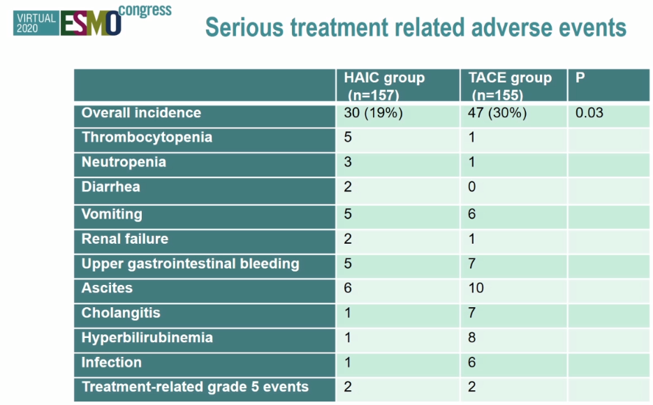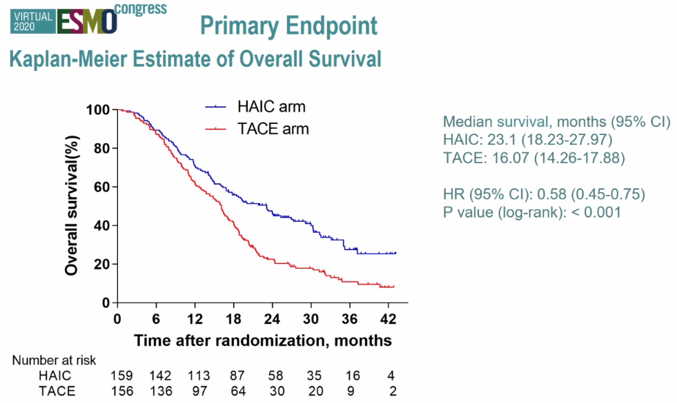 结果:315例患者被随机分至HAIC组(n=159)或TACE组(n=156),至2020年4月本次分析数据截止时,HAIC组中位OS为23.1个月,TACE组为16.07个月,HAIC较TACE显著延长中位OS(HR 0.58[95% CI, 0.45−0.75],P<0.001)、客观缓解率(RECIST: 45.9 [73] vs. 17.9% [28], P <0.001; mRECIST: 48.4 [77] vs. 32.7% [51], P=0.004)和中位PFS(9.63个月 vs. 5.40个月,HR=0.55[95% CI, 0.43−0.71],P<0.001)。HAIC组23.8%患者(38例)肿瘤缩小之后成功实施根治性切除术,显著多于TACE组的11.5%(18例,P=0.004)。TACE组47例患者(30%)、HAIC组30例患者(19%)发生治疗相关严重不良事件,且各有2例患者因治疗死亡。两组患者多数接受靶向、消融、免疫等后续治疗。