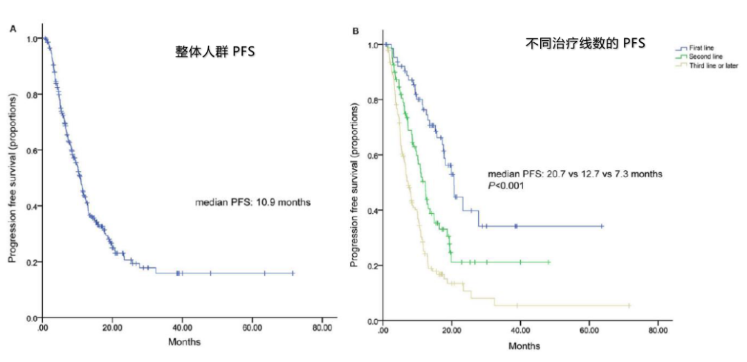 已证实曲妥珠单抗(T)和拉帕替尼(L)联合治疗可显著改善经多线治疗的HER2+转移性乳腺癌(MBC)患者的预后,而曲妥珠单抗和拉帕替尼(TL)联合化疗(TLC)能否进一步提高HER2+ MBC的疗效尚待进一步研究。复旦大学附属肿瘤医院进行了一项回顾性、多中心的研究,共纳入285例确诊为MBC且HER2过度表达的女性患者,接受曲妥珠单抗6mg/kg每周一次(在初始8mg/kg负荷剂量后)+拉帕替尼(750mg~1250mg/天)+化疗。联合TL最常见的化疗方案是卡培他滨(40.7%)和长春瑞滨(21.4%),几乎1/3在TLC后接受维持治疗。整体人群中位PFS 10.9个月,不同治疗线数mPFS分别为一线20.7个月vs二线12.7个月vs三线 7.3个月,P<0.001(图3)。证实TLC在HER2+转移性乳腺癌中令人鼓舞的疗效和可耐受的安全性,为临床实践提供了理论依据。