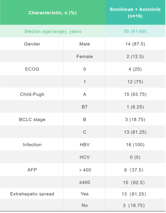 结果:截至2020年6月30日,共入组16例患者,其中男性14例,中位年龄56岁(41-70岁),BCLC B/C(3/13),Child-Pugh A/B7(15/1)。所有患者均接受至少两个周期的治疗,中位周期为7(范围2-18)。中位随访时间为5.3个月(范围2.1-13.3)。