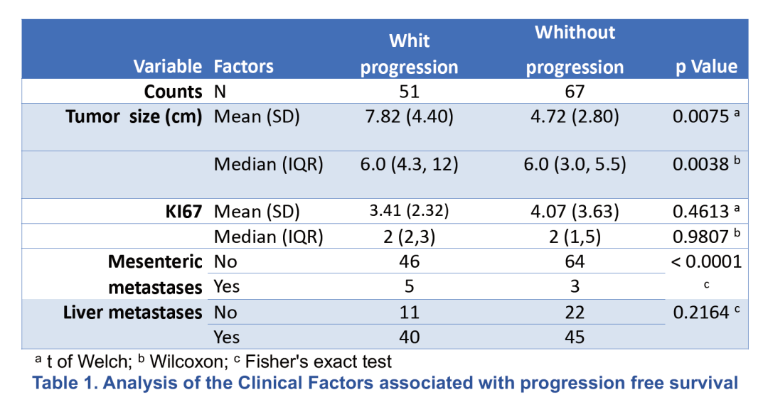 该回顾性研究纳入了120例接受SSA一线治疗(长效奥曲肽和兰瑞肽)的晚期高/中分化的胰腺及肠道NET患者,主要终点为根据RECIST 1.1评价的无进展生存期(PFS),次要终点为临床因素与总生存期之间的相关性。结果显示,120例患者平均年龄56.59 ± 12.59岁,瘤体大小5.97 ± 3.82 cm,起源部位:胰腺35.83%,中肠36.67%,后肠20.83%,其他6.67%。79.50 %的患者使用长效奥曲肽作为一线治疗。所有患者的中位PFS为31.62 个月,其中pNET PFS为24.5 ± 19.5 (3.77 - 97) 个月。奥曲肽组中位OS 117.20个月,兰瑞肽组中位OS 94.60个月,未观察到不同SSA之间OS的差异(P=0.12)。单变量分析未显示不同性别、年龄、临床分期、ECOG体能状态的PFS差异。