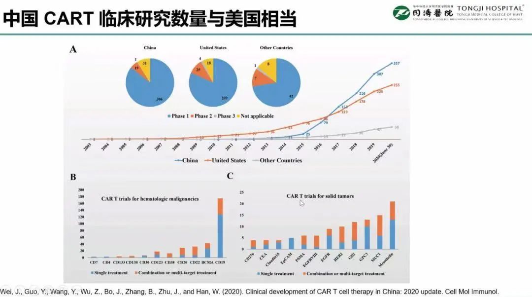 周剑峰教授:事实上,CAR-T细胞治疗是在经历了30年的发展之后率先于国外“开花结果”,目前已有四种CAR-T产品先后在美国、日本、欧洲等地区批准上市并应用于临床治疗。与之比较,中国CAR-T细胞治疗同样取得了显著的进展,根据2020年的最新数据显示,我国CAR-T治疗的临床试验的登记数量已经与美国旗鼓相当了,相关的生物技术公司也在积极研发和申报CAR-T产品。