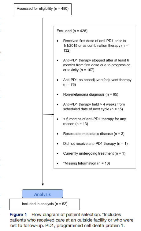 研究者回顾了2015年1月1日至2018年12月31日在Huntsman癌症中心接受单药PD-1抑制剂治疗的晚期皮肤黑色素瘤患者的数据,以确定连续治疗的一系列患者。纳入标准包括:年龄≥18岁,病理诊断为晚期皮肤黑色素瘤(不可切除的Ⅲ期或Ⅳ期),接受单药抗PD-1治疗1年(>6个月且<18个月)。在1年后停止抗PD-1治疗是肿瘤医师和患者在持续治疗反应或疾病稳定的背景下共同决定的。