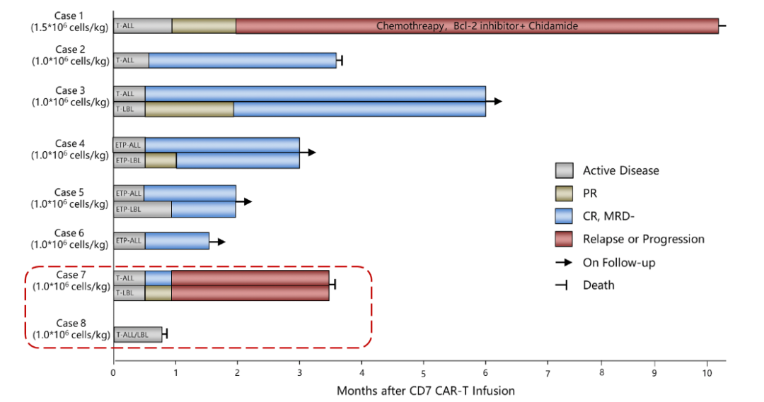 图2 CD7 CAR-T治疗T-ALL或T-ALL/LBL的治疗反应和反应持续时间