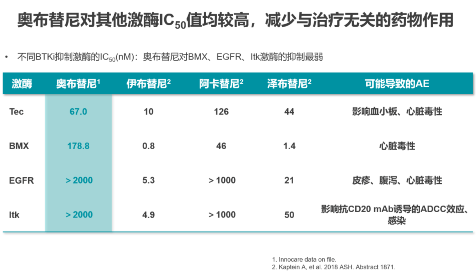 传统BTK抑制剂最常见也是最容易导致治疗中断的副作用主要是出血和房颤,基础研究显示正常血小板上同时表达BTK和TEC二种激酶,均参与胶原诱导的血小板活化促进凝血,单独BTK缺失可通过TEC进行功能代偿[2]。由于传统BTK抑制剂的脱靶效应导致对BTK和TEC的同时抑制,从而影响胶原诱导的血小板聚集功能,提高出血事件的发生风险。正常心肌细胞上除表达BTK之外,还表达 EGFR和BMX,因此在使用传统BTK抑制剂时其脱靶效应也会抑制心肌细胞上的BMX和EGFR[3,4],因此带来房颤副反应。分子改构后的BTK抑制剂奥布替尼,对BTK之外的其他激酶,尤其是EGFR和BMX的IC50非常高,因此脱靶抑制TEC、EGFR和BMX的作用更小,从而降低出血和房颤事件的发生。