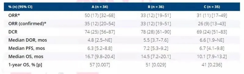 结果:Ⅱ期共招募93例患者,随机分配至A、B、C 3个开放标签组,分别24、30、29例。联合Ⅰb期进行分析,总共105例患者(34例、36例、35例)纳入疗效分析,108例纳入安全性分析(36例、37例、35例)。平均随访14个月。基线资料行组间匹配,包括肿瘤负荷、是否肝转移、分期(1~3 vs. 4)。主要研究终点1年OS率在A、B、C组分别为57%(P=0.0007)、51%(P=0.029)、41%(P=0.236)。TRAE(治疗相关不良事件)发生率在各组间类似,与Ⅰb期结果一致。共有8例患者(7%)因AE导致治疗中断(6、1、1);40例患者(27%)出现严重的TRAE(14、15、11),2例因TRAE死亡(B、C组中分别1例因急性肝衰竭、颅内出血死亡)。
